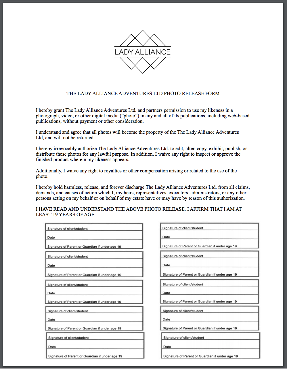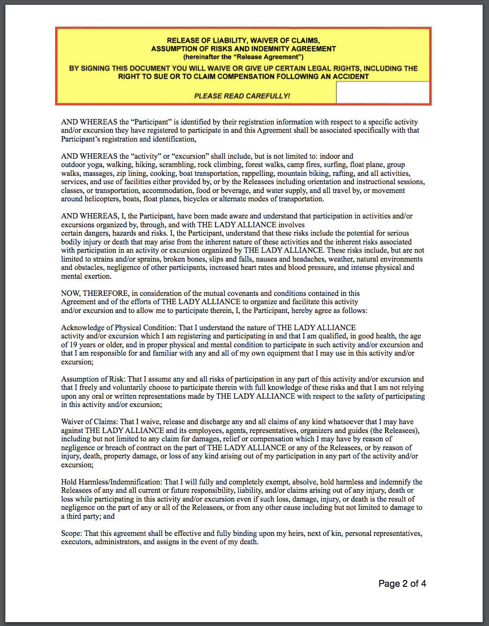The Non-Compete is relatively general. We have joined forces with you because of your passion for building confidence in women+ and your excitement towards adventure and mental wellness. If you have held events for women+ prior to The Lady Alliance Foundation, or want to continue holding events for women+ after your time with The Lady Alliance Foundation, we commend you and encourage you to do so. We will not limit you from creating and hosting events after your time with the Foundation.